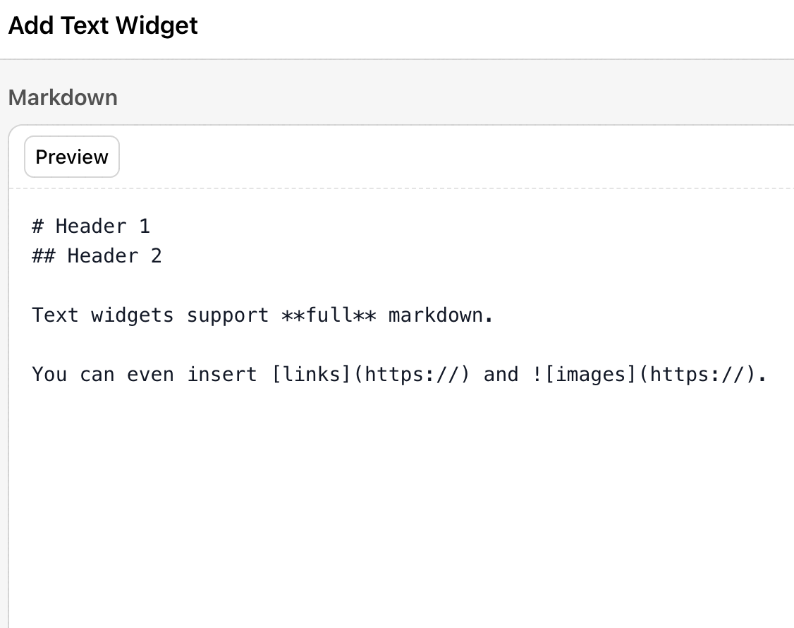 Dashboards in Adept start empty when they are created, but they can be filled with widgets. Adept currently supports 4 widget types: table, text, metric and chart.